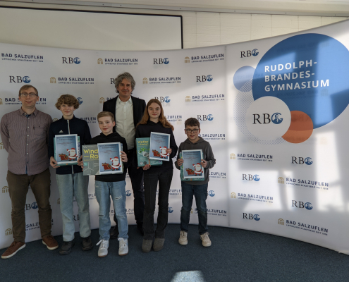 Nach den Weihnachtsferien erhielten vier Schülerinnen und Schüler eine Urkunde und einen Sachpreis für besonders gute Leistungen. Leni (7e), Malte (7b) und Marlon (5b) belegen zusammen den zweiten Platz und haben eine kleine Wetterstation als Preis erhalten. Aaron (6d) belegt den ersten Platz und hat ein Windkraftwerk-Modellbauset erhalten. Die Preise sind freundlicherweise vom Förderverein zur Verfügung gestellt worden.