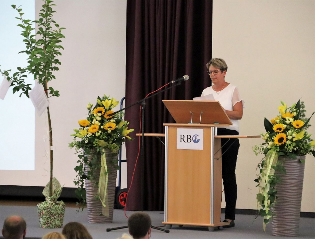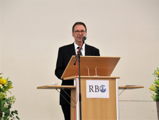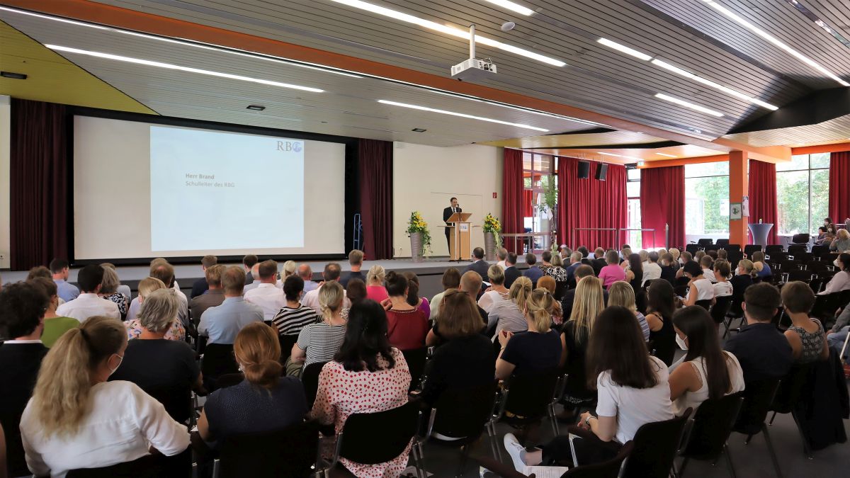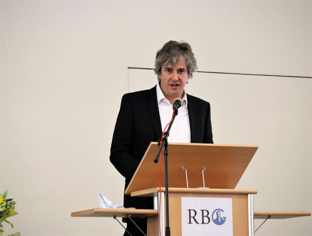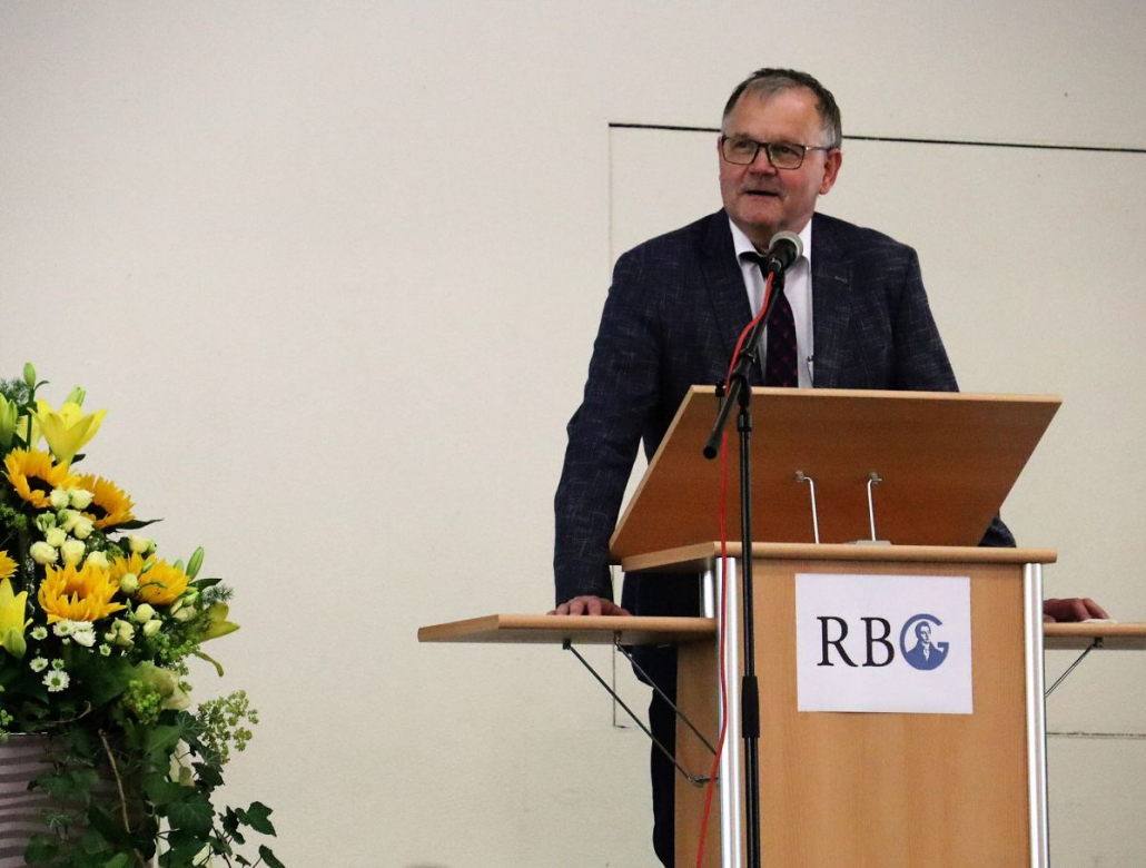 In einer sehr persönlich gehaltenen Rede bedankte sich Eckhard Brand schließlich für die vielen freundlichen Worte und überbrachten Glückwünsche und Geschenke. Dabei betonte er, dass er den Beruf des Lehrers und Schulleiters immer mit viel Herzblut versehen habe. Doch sei er dabei kein Einzelkämpfer gewesen, sondern habe die Arbeit im Team bevorzugt. Selbstkritisch merkte er an, dass er zu Anfang seiner Tätigkeit am RBG vielleicht etwas zu ungestüm vorgegangen sei, mancher vielleicht der Ansicht gewesen sei, dass er die gesamte Schule habe umkrempeln wollen, doch dabei sei es ihm vor allem um die Weiterentwicklung der Schule, aufbauend auf dem vorhandenen Guten, gegangen. Tatsächlich seien in den folgenden Jahren große Projekte zu meistern gewesen. Er erinnerte an die sich über sechs Jahre hinziehende Fusion der beiden Gymnasien, das neue Schulprogramm, die Qualitätsanalyse, der sich die Schule habe stellen müssen, die Setzung und inhaltliche Füllung der beiden Schwerpunkte MINT und CertiLingua sowie die Pandemie, die aber immerhin der ebenfalls bereits initiierten Digitalisierung einen kräftigen Schub gegeben habe. Bei all diesen Prozessen habe ihm die Zusammenarbeit mit der gesamten Schulgemeinschaft am Herzen gelegen. Besonderen Dank sprach er dabei noch einmal seinem Stellvertreter Clemens Boppré aus, mit dem er kongenial zusammengearbeitet habe. Natürlich habe er sich Gedanken gemacht, was er vermissen werde: Abgesehen von der „gut aufgestellten Schule“, die er zurücklasse, sei es vor allem der „Umgang mit jungen Menschen“, von denen er immer ein positives Bild gehabt habe. Wenn er die ganzen Jahre seinen Dienstpflichten engagiert habe nachkommen können, dann sei dies nicht zuletzt seiner Gattin zu verdanken, die ihm stets „den Rücken freigehalten“ habe, wofür er ihr herzlich danke.