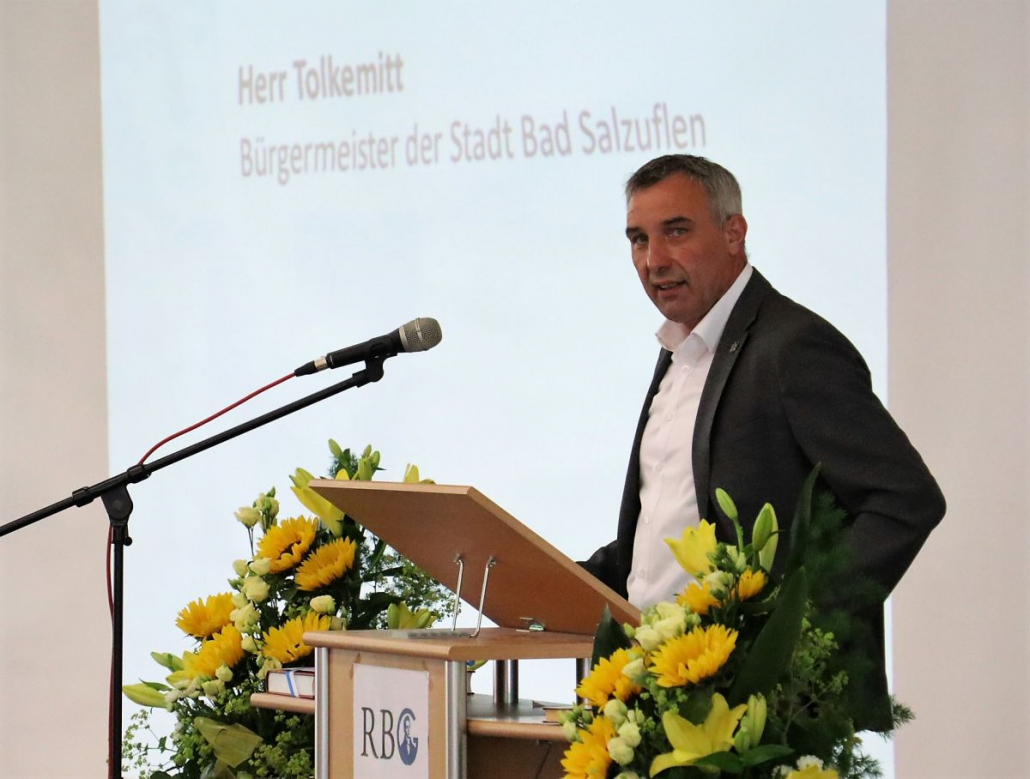 Bürgermeister Dirk Tolkemitt berichtete in seiner durchaus humorvollen Rede ebenfalls über angenehme und konstruktive Gespräche und attestierte dem scheidenden Schulleiter, dass er – in Anlehnung an den Benediktinerpater Anselm Grün – immer mit seiner Arbeit im Einklang gestanden habe, was er als ein hohes Gut bezeichnete. Auch habe Brand Maßstäbe gesetzt, so etwa bei der sich über Jahre hinziehenden Fusion der ehemals zwei Bad Salzufler Gymnasien. Zudem habe er der Schule ein „unverwechselbares Profil“ gegeben. Dafür bedankte Tolkemitt sich im Namen des Schulträgers sehr herzlich und empfahl dem künftigen Pensionär, seinen Lebensabend schon allein dadurch zu genießen und zu verlängern, indem er häufig den Bad Salzufler Kurpark aufsuche.
