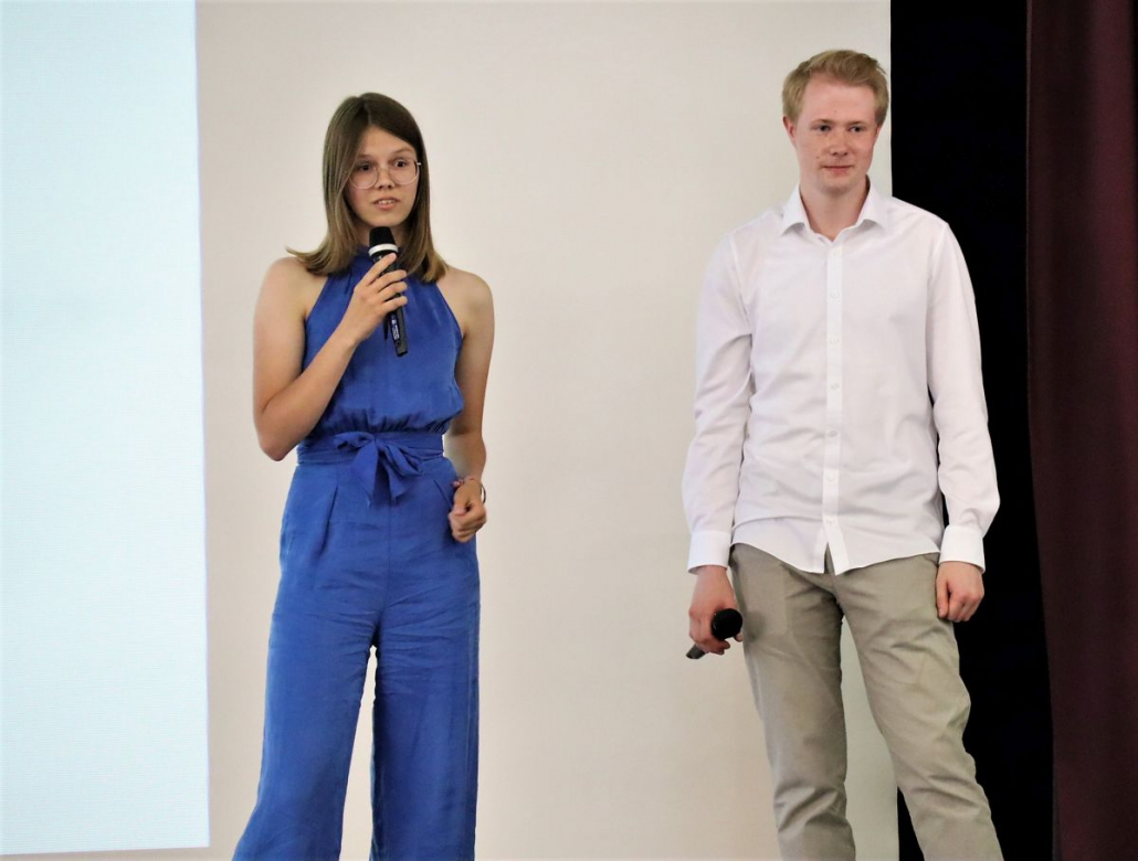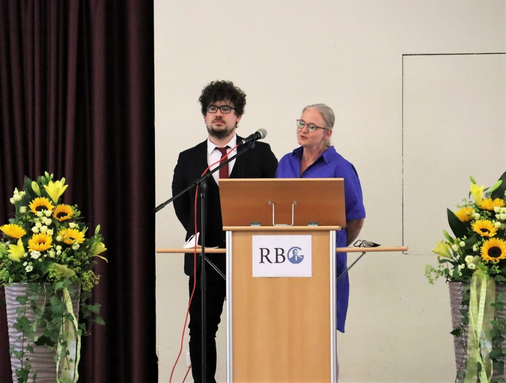 Die Schülerinnen und Schüler des RBG, vertreten durch die Schülersprecherin Nele Reschinsky und den ehemaligen Schülersprecher Paul Janzen, hatten sich für ihre Dankesworte etwas Besonderes einfallen lassen. Via Videoclips wurden die Aussagen verschiedener früherer SV-Vertreterinnen und Vertreter eingespielt, die uni sono zeigten, dass ihr Schulleiter die Schülermitwirkung sehr ernstgenommen habe. Nur so hätten sich zahlreiche Vorhaben wie der Charity-Walk oder die Junior-Wahlen realisieren lassen. Stets sei dabei der Umgang miteinander vertrauensvoll gewesen. Respekt zollten sie abschließend der hohen Arbeitsleistung ihres Schulleiters und gaben ihm den wohlmeinenden Rat „Herr Brand, genießen Sie nun aber wieder einmal die Natur!“.