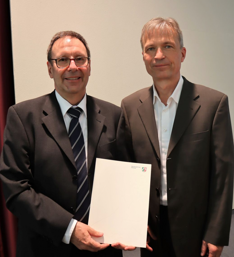 Im Anschluss trat Michael Hypius, schulfachlicher Dezernent bei der Bezirksregierung Detmold, ans Rednerpult und skizzierte, gespickt mit Zitaten aus früheren dienstlichen Beurteilungen, den beruflichen Werdegang Eckhard Brands. Den Höhepunkt stellte allerdings die Überreichung der Urkunde dar, durch die der bisherige Schulleiter des Bad Salzufler Rudolph-Brandes-Gymnasiums mit Ablauf des Monats Juli in den Ruhestand versetzt wird. Bei dieser Gelegenheit sprach Hypius den Dank und die Anerkennung des Landes Nordrhein-Westfalen für die geleistete Arbeit aus.
