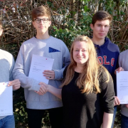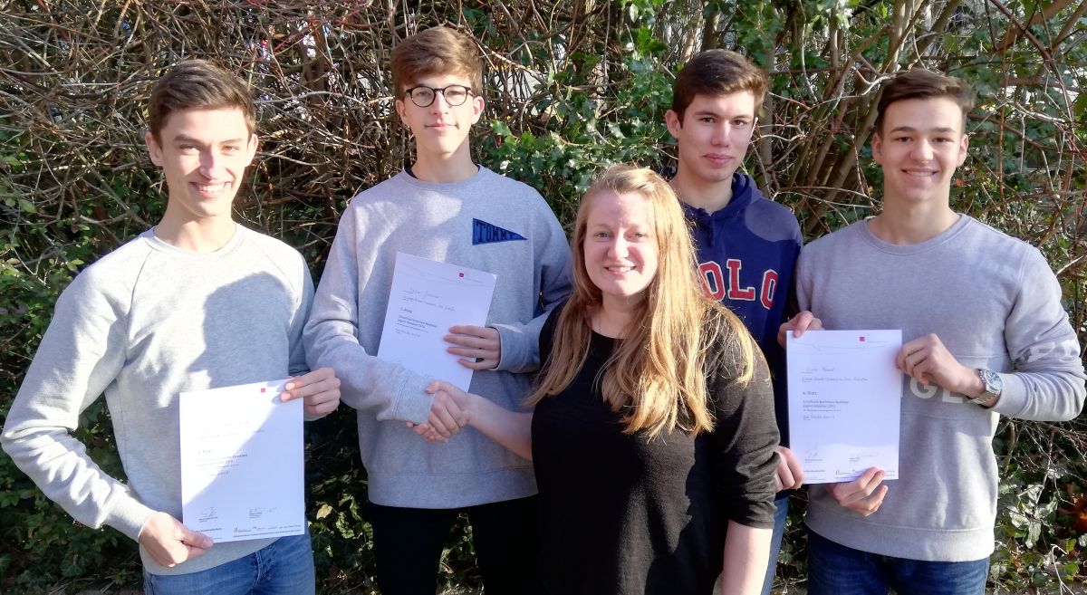 Tom Vincent Lange, Mika Jaschinski, betreuende Lehrkraft Rebecca Kinzl, Lucas Brand und Cedric Fricke (v.l.n.r.)