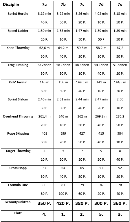Nach Absolvierung aller zehn Stationen gab es eine kurze Umbau- und Erholungspause, bevor als „Krönung“ die 11. Disziplin, das „Formula 1“ – Rennen gestartet wurde. Hierfür hatte jede Klasse ihre sechs ausdauerndsten Sportlerinnen und Sportler aufgestellt, deren Aufgabe es war, in 8 Minuten einen Hindernis-Rundparcours so häufig wie möglich zu durchlaufen. Angefeuert durch die Klassenkameradinnen und -kameraden, die den Wettkampf von der Seite aus lautstark begleiteten, wurden nun noch einmal alle Reserven mobilisiert und wirklich beachtliche Ergebnisse erzielt.