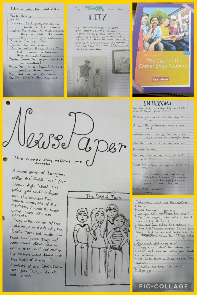 Neben den analytischen Aufgaben kam auch die Kreativität nicht zu kurz: Die Lernenden gestalteten „Wanted Poster“, um das SHoCK Team bei der Suche nach den Räubern zu unterstützen, oder entwarfen ein eigenes Logo für das SHoCK Team. Außerdem übten sie das Schreiben fiktiver Interviews, die anschließend in einer selbst erstellten Newspaper festgehalten wurden.