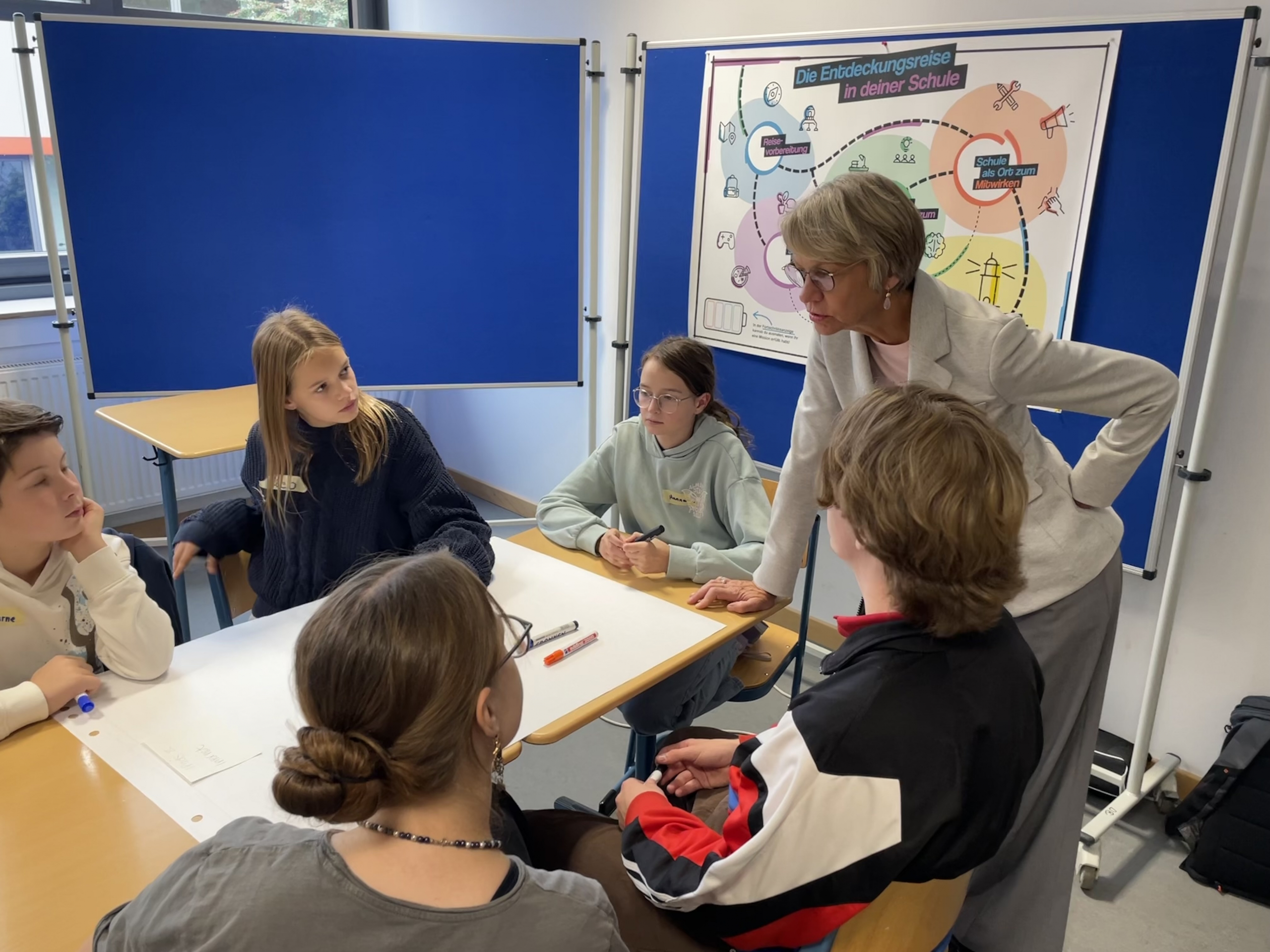 Am 29.09.25 hieß das Rudolph-Brandes-Gymnasium die Ministerin für Schule und Bildung NRW, Frau Dorothee Feller, im Rahmen des Projekts „Your Vision Schule NRW“ herzlich willkommen. Seit dem letzten Jahr haben Schülerinnen und Schüler der 6. und 7. Klassen im Rahmen einer Arbeitsgemeinschaft unter Leitung der Lehrerin Rebecca Kinzl am Projekt „Your Vision Schule NRW“ der Deutschen Kinder- und Jugendstiftung teilgenommen. Dank einer erfolgreichen Bewerbung als Vertiefungsschule und der finanziellen Unterstützung des Schulministeriums NRW, stehen den Schülerinnen und Schülern nun 1000 Euro zur Verwirklichung eines Projektes zur Verfügung. Um dieses und weitere Projekte zielorientiert anzugehen, wurde gemeinsam mit der Schülervertretung ein Workshop zum Thema Projektplanung durchgeführt. An diesem nahm auch Dorothee Feller teil, die sich vor Ort ein Bild vom Projekt und den Wünschen der Schülerinnen und Schüler machen wollte. So ergab sich für die Teilnehmenden die großartige Gelegenheit, mit der Ministerin über ihre Wünsche und Verbesserungsvorschläge zu sprechen. „Die älteren als auch die jüngeren Schülerinnen und Schüler konnten mit der Ministerin auf Augenhöhe unsere Projektideen diskutieren und so zusammen unsere Ideen voranbringen“, bilanziert Emma Nielebock, die Schülersprecherin.