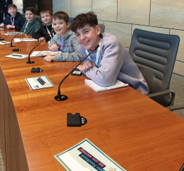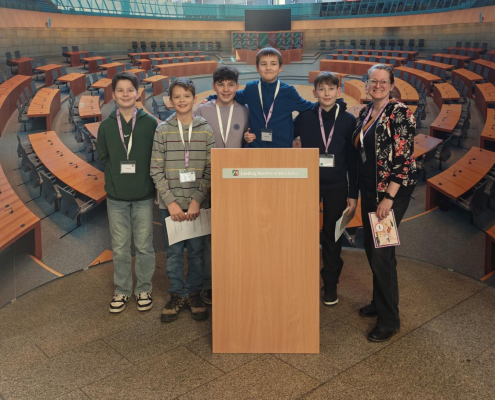 Beim Besuch im Landtag konnten alle Ideen, Wünsche und Bedarfe mit knapp 150 anderen Schülerinnen und Schülern ausgetauscht und in Workshops weiterentwickelt werden. Trotz des, eigentlich freien, beweglichen Ferientags nahmen fünf Schüler aus dem sechsten und siebten Jahrgang an der Veranstaltung teil. Das Interesse war eigentlich noch größer, aber die Teilnehmendenanzahl pro Schule war begrenzt. Nach der Workshoparbeit bildete die Präsentation der Ergebnisse im großen Plenarsaal des Landtages den Tagesabschluss. Auf den Stühlen der Landtagsabgeordneten saßen alle Schülerinnen und Schüler, aber auch die Schulministerin, Mitarbeitende des Ministeriums sowie Vertreterinnen und Vertreter des Schulausschusses des Landtags. Die Schulministerin Dorothee Feller ging auf die präsentierten Vorschläge ein und stand Rede und Antwort. Für Tristan, Jarne, Jarno, Mads und Miko vom Rudolph-Brandes-Gymnasium und alle weiteren Lernenden eine großartige Gelegenheit! Auch für Rebecca Kinzl, die betreuende Lehrkraft, ist die Teilnahme am Projekt ein voller Erfolg: „Durch das Projekt sehen die Schülerinnen und Schüler ihre Schule mit anderen Augen. Sie merken, dass ihre Ideen Gehör finden und zu tatsächlichen Veränderungen führen können. Das motiviert sie sehr, sich auch weiter einzubringen. Durch das Projekt ist es uns gelungen, auch jüngere Lernende für die Schulentwicklung zu gewinnen und sie dabei zu unterstützen, sich für ihre Ideen und Wünsche stark zu machen. Das stärkt sie und ist ein wesentlicher Bestandteil guter Demokratiekompetenz.“