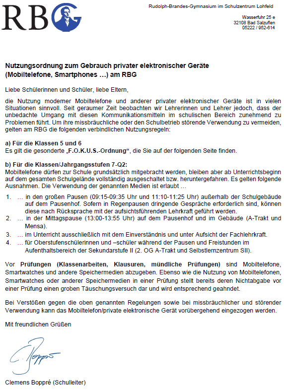 Neue Nutzungsordnung zum Gebrauch privater elektronischer Geräte (Mobiltelefone, Smartphones, …) am RBG