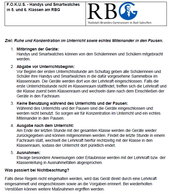 Smartphones und andere digitale Geräte nehmen in unserer Gesellschaft einen immer größeren Wert ein. Zum zielführenderen Umgang mit diesen Geräten hat sich das RBG in den letzten Jahren intensiv mit der Ausarbeitung einer neuen Nutzungsordnung auseinandergesetzt, welche seit August 2025 fertiggestellt ist und dauerhaft überprüft bzw. weiterentwickelt wird.