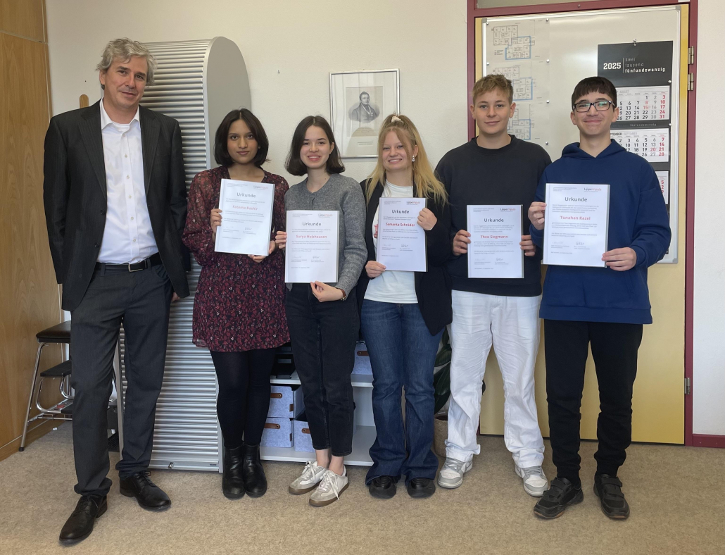 Am vergangenen Montag erhielten nun folgende Schülerinnen und Schüler aus der Hand ihres Schulleiters Clemens Boppré die entsprechenden Urkunden und einen Antrag zur Abrufung eines namhaften Geldbetrags: Je 500 € gingen an zwei Abiturientinnen des Jahrgangs 2025: Fatema Bashir und Surya Holzhausen, je 250 € an Tunahan Kazel (9 a) und Theo Siegmann (9 b) sowie 200 € an Samanta Schröder (10 b).