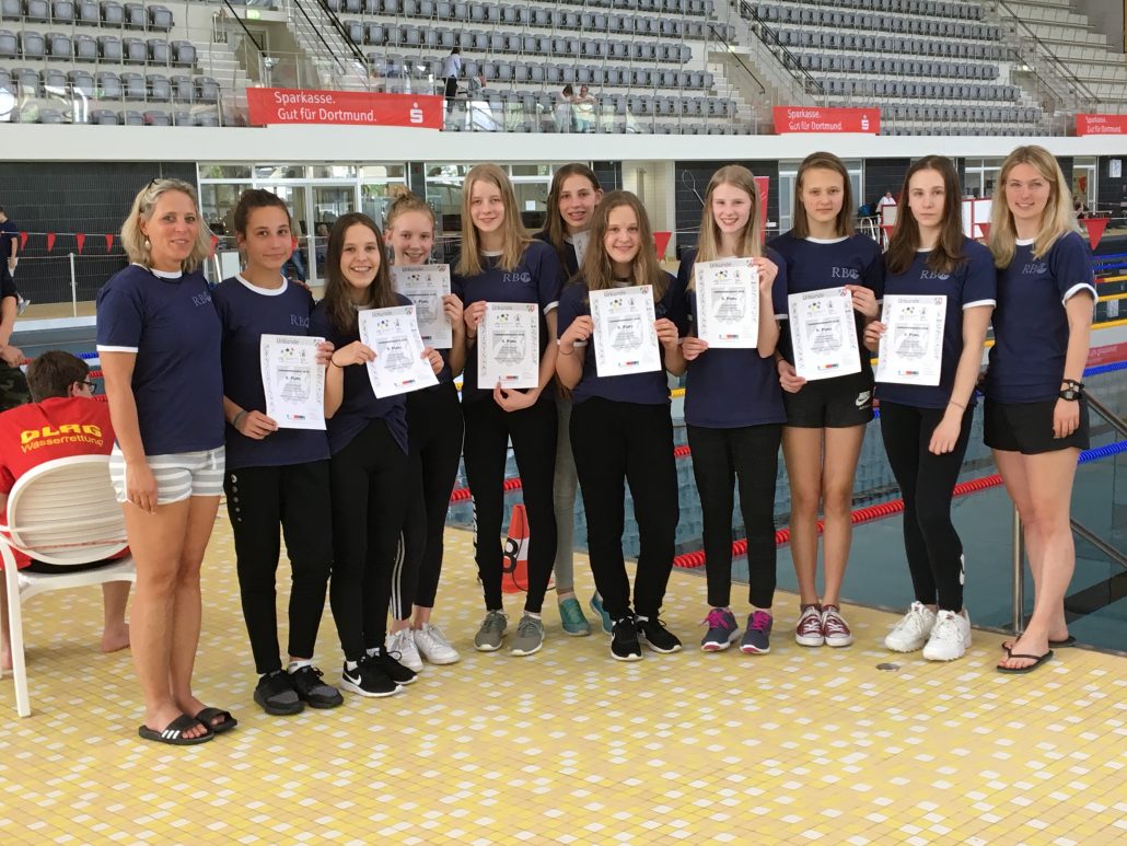 Und so traf man sich, während die Mitschüler/innen noch faul in den Betten liegen konnten, bereits in aller Frühe um 6:30 Uhr am RBG, und konnte so immerhin den Sonnenaufgang bewundern. Rieke Fuhrmann, Anna und Lina Haberstroh, Lilly Kappel, Isabel Krawinkel, Marie Föste, Nina Loos, Viktoria Stork und Helen Jahns-Kantelberg traten nun pünktlich in Begleitung von Frau Buff und Frau Rudolf die Fahrt zum Südbad in Dortmund an. Dort fand das Finale der Landesmeisterschaften im Schwimmen statt. Die Fahrt verlief glatt und so kamen wir pünktlich am Wettkampfort an. Nachdem die Formalitäten der Anmeldung erledigt waren, konnte alle Mannschaften und deren Begleiter in die Schwimmhalle gehen. Trotz einiger geringen organisatorischer und technischer Schwierigkeiten, ging das Wettkampfgeschehen ziemlich zügig voran. Die Mannschaft musste in folgenden Disziplinen antreten und so startete sie: