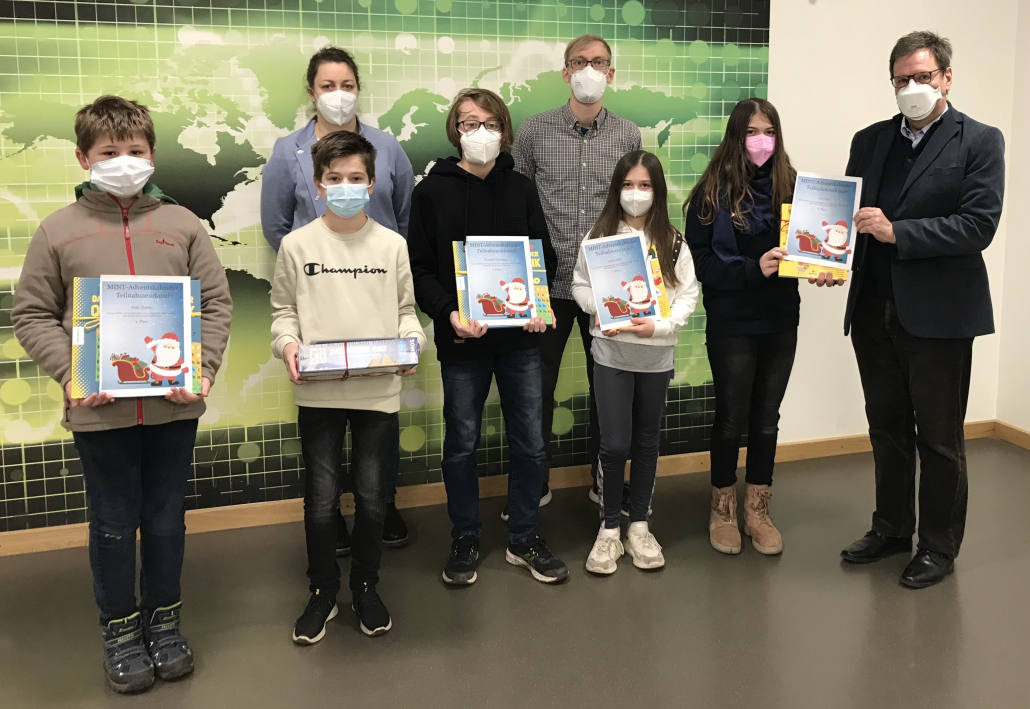 Mit Freude überreichte Herr Brand am 04.02.2022 die Preise des MINT-Adventskalenders an die Gewinner*innen. Jeden Tag öffneten sie im Dezember 2021 ein Türchen, hinter dem sich ein neues, spannendes Rätsel und viele Experimente zum Nachmachen befanden und so die Zeit bis Weihnachten verkürzten.