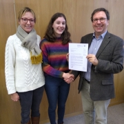 Schulleiter Herr Brand und Frau Kucza (Sprachenkoordinatorin) überreichen Amelie das persönliche Gratulationsschreiben von Yvonne Gebauer, der Ministerin für Schule und Bildung des Landes Nordrhein-Westfalen